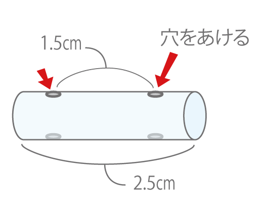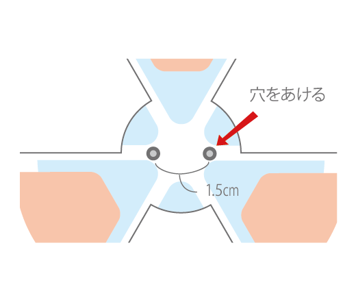 円の中心(ちゅうしん)に、図のように1.5cm間をあけて、穴(あな)を2つ開けます。
