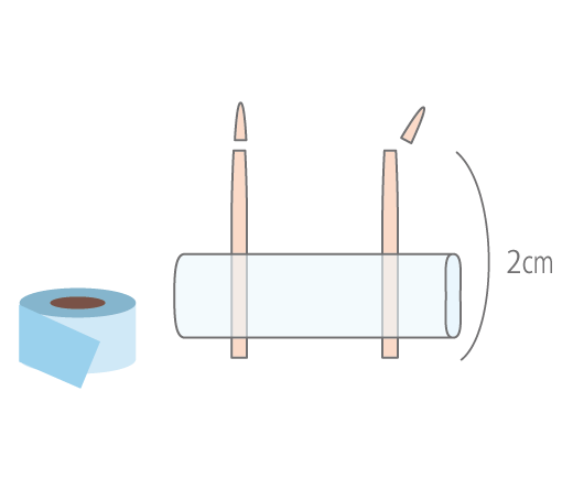 〈5〉の穴にさし込んで、ストローをつぶし、ようじが抜けないように、セロハンテープで止めます。 -
