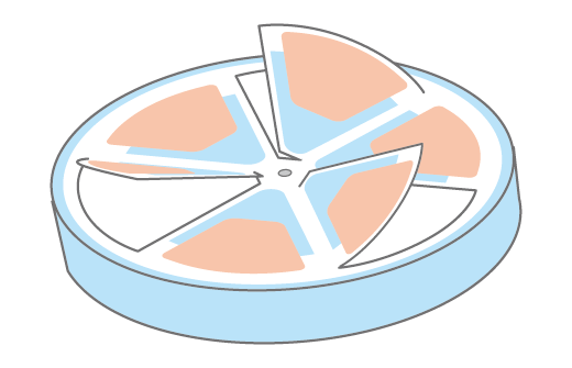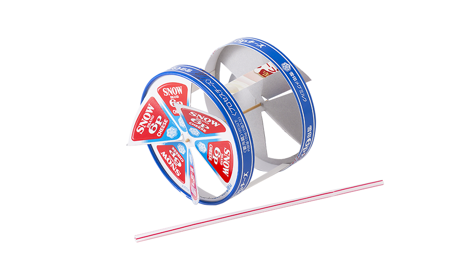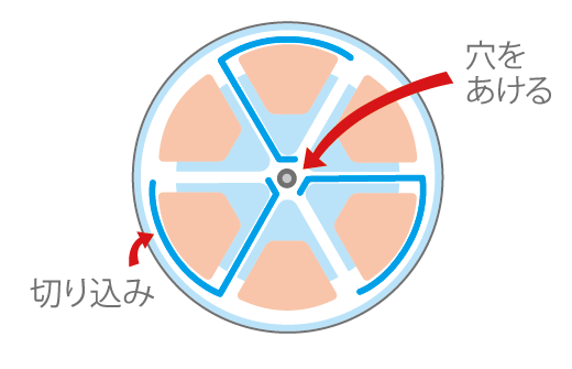 6Pチーズのフタは、図のように切り込みを入れ、中心(ちゅうしん)には、竹ぐしを通す穴(あな)を開けます。