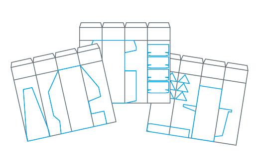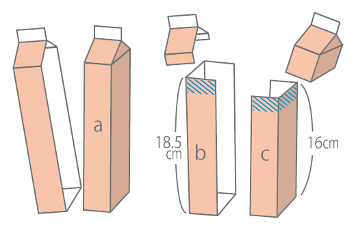 牛乳パックの開いていないものは、2つとも屋根(やね)がついたまま半分に切ります。1つは18.5cmに、1つは16cmに切ります。
