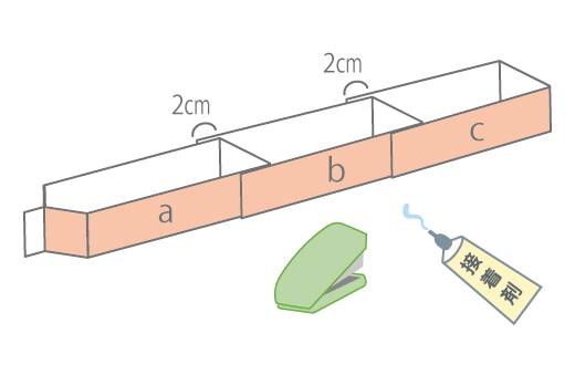 図のように、2cmずつかさねてつなげ、接着(せっちゃく)します。ホチキスで止めて、補強(ほきょう)します。