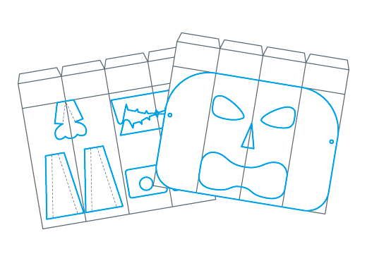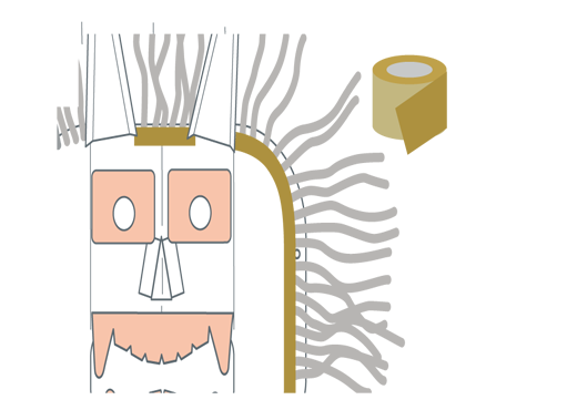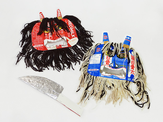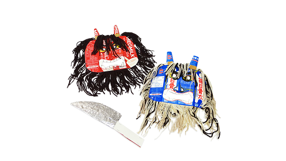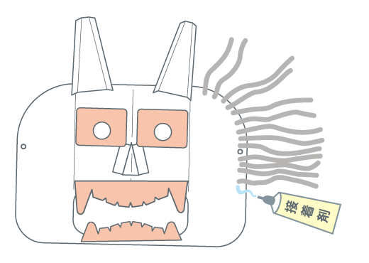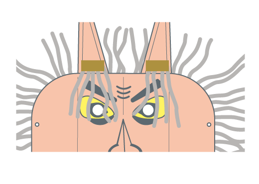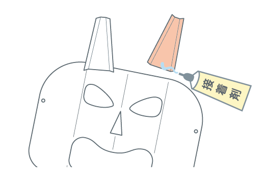 (お面をかぶってみて、きついようであれば、もう1こ輪ゴムをつなげましょう。) -