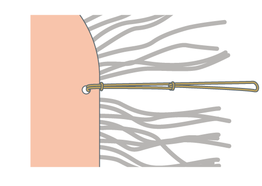 お面の裏のフチに、接着剤をぬり、20cmくらいの長さに切ってた毛糸(けいと)を、はっていきます。