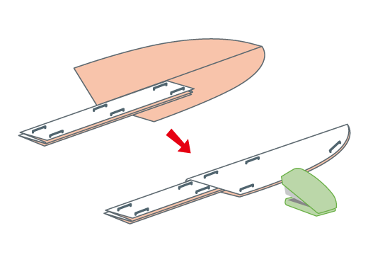 〈b〉で〈a〉を半分はさみ、ホチキスでとめます。
