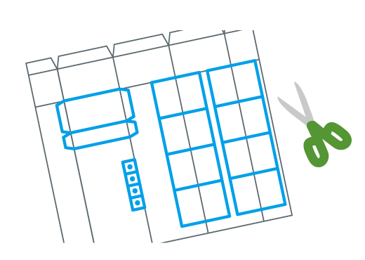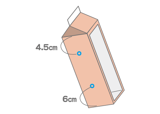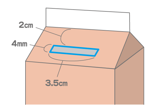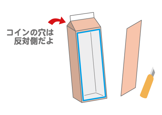 牛乳パック1こは、屋根(やね)にコインを入れる穴(あな)をあけます。