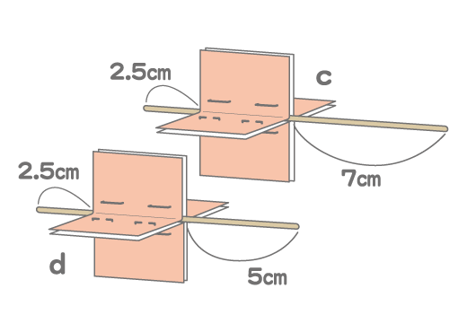 真ん中に竹ぐしを通します。それぞれの竹ぐしが、図の寸法になるようにします。 -