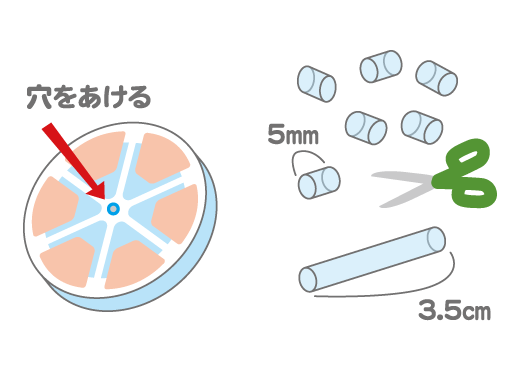 上の竹ぐしには、3.5cmに切ったストローをとおしてから、6Pチーズのフタとはどめをとおして、接着剤で固定します。 -