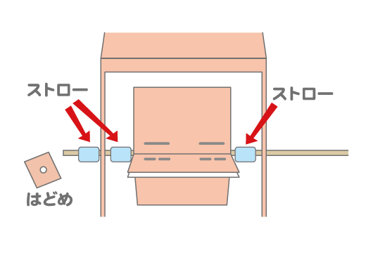 図のように、ストローをとおして、内側から穴にとおします。もう一度ストローをとおして、はどめを差し込み、接着剤で固定します。