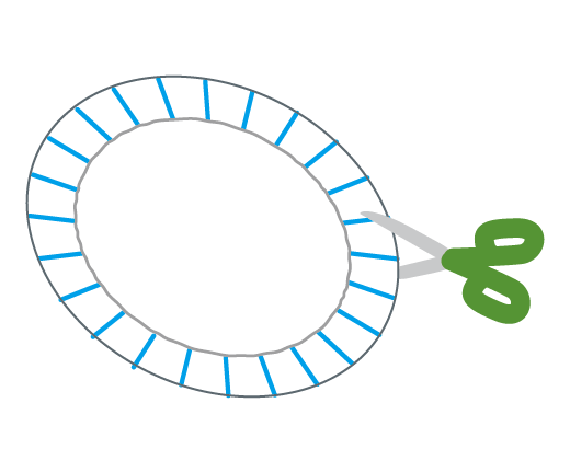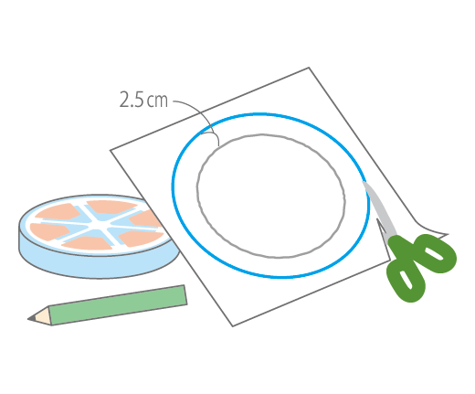 6Pチーズのフタを色紙にのせて、えんぴつなどで丸く線(せん)をひきます。2.5cmほど大きめに、丸く切り取ります。