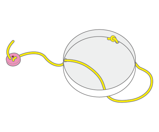 6Pチーズの底箱(そこばこ)の穴(あな)に、図のようにゴムひもを通し、先端(せんたん)にボタンを通します。