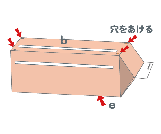 〈b〉の面と、反対側(はんたいがわ)の〈e〉の面の四隅(よすみ)に、はりがねを通す穴を開けます。