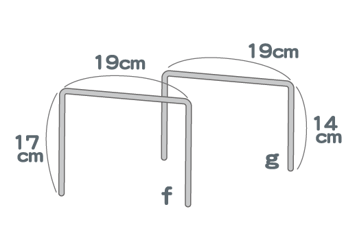 はりがねを、高さ17cm×幅19cmのコの字型〈f〉と、高さ14cm×幅19cmのコの字型〈g〉におり曲げます。
