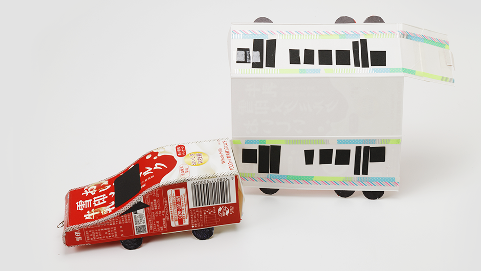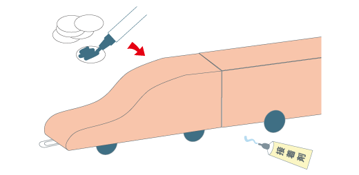 〈4〉で切り取った車輪(しゃりん)は、黒くぬります。車体(しゃたい)の前は、下の部分に切り込みを入れ、車輪を差し込んで、セロテープや接着剤(せっちゃくざい)で固定(こてい)します。車体の後ろがわには、接着剤ではり付けます。