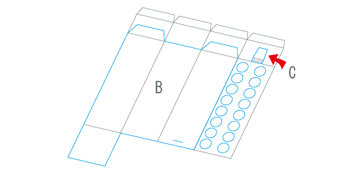 〈C〉ののりしろを、〈B〉ののりしろにテープではり、差し込み用(さしこみよう)のタブを作ります。