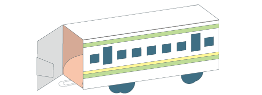 横面に、新幹線のボディをイメージして絵を描き(かき)、図の部分(ぶぶん)を切り取ります。反対側(はんたいがわ)も、同じように切り取ります。 -