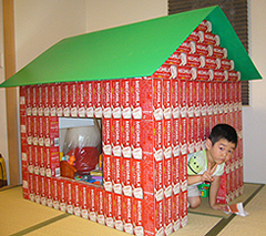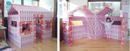 「かなりの力作です。1Lの牛乳を214本使用した高さ120cmのお家で、本当は、屋根もメグミルクにしたかったのですが、プラスティックの段ボールのようなもので作ってあります。子供も大喜びの出来上がりでした。