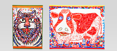 神奈川県高座郡寒川町在住の磯崎功様(71歳)より、また素晴らしい作品のお便りを頂きました。2008年の干支の丑と、2009年の寅のパネルです。細かくパッケージを切り、色を合わせて動物の絵に仕上げています。牛乳パックを使った虎(楽しい工作「うなずきトラ」)も一緒に送って下さいました。磯崎様の作品を、作ってみませんか?