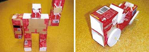 土台を段ボール箱で作り、牛乳パックで機関車の形を作る。