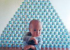 実家の母と姉が、息子が最初は3個のヨーグルトカップで遊ぶ姿を見て喜び、毎日食べているヨーグルトを210個まで溜めてくれたので、ピラミッドにして写真を撮りました。