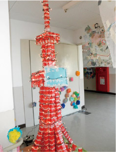 東京スカイツリーにちなんで、634個の牛乳パックを使って作成しています。牛乳パックは、学校のみんなで、きれいに洗って乾かして、準備しました。