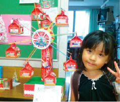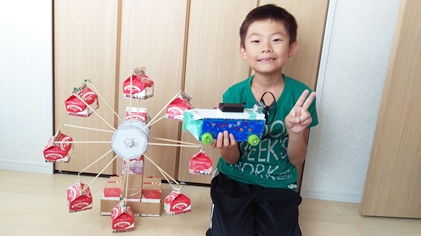 「小学校にあがって初めての夏休みを迎え、宿題で出された自由工作に大観覧車を作成しました。カッターを使うところは私がやりましたが、ほとんど全てを集中してがんばりました。一番楽しそうにやっていたのは完成後のデコレーションでした。