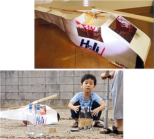 「電気や燃料を使わず、ヘリコプターを飛ばそう!」をテーマに、ペットボトルロケットを原理とし、機体を全て牛乳パックで製作。実際に飛ばすことができるヘリコプターです。