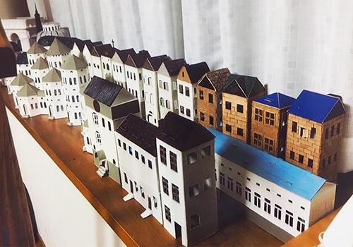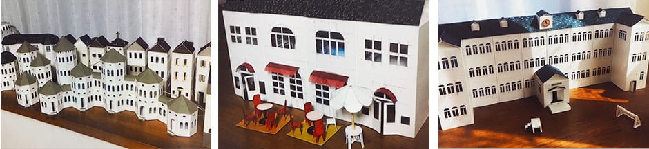 色んな形の家を作っていたら、どんどん増えて小さな街のようになったそうです。街にはテーブルなどの、ちょっとした小道具まであって素敵ですね。