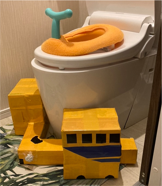 親子で一緒に牛乳パックを並べて、ガムテープを貼り、新幹線をイメージしてデザインしました。2歳の息子は、完成品を小さな体でてくてくトイレまで自分の足で運び、初めて「トイレ成功」したときには、にっこり満足げで母と大喜びしました!・・・とのお便りです。