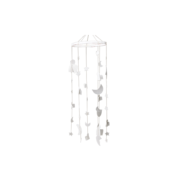 吊り天使(つりてんし)と三日月(みかづき)と星(ほし)が、かすかな風でヒラヒラ揺(ゆ)れるよ。