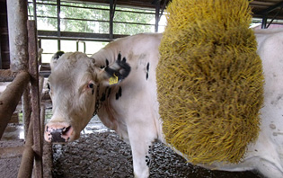 天井にはたくさんの扇風機が取り付けられて、涼しい風を送っています。また、巨大なブラシが用意されていて、牛たちが体のかゆいところをこすりつけるとブラシが自動回転して身体を清潔にしてくれます。