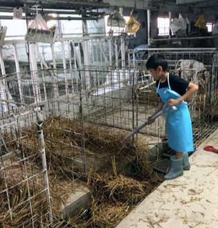 牛舎でお手伝いをするお孫さん