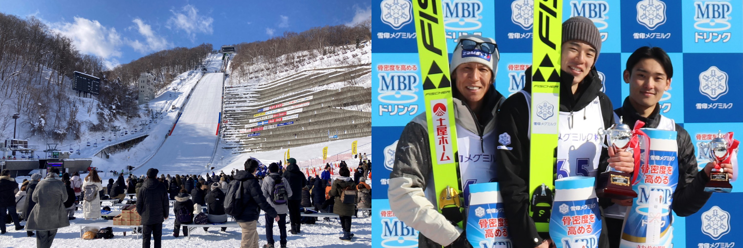 北海道の冬の風物詩として、1958年の第1回以来長きにわたり親しまれてきた「雪印メグミルク杯ジャンプ大会」や、2021年からは「雪印メグミルクカツゲンカップ」に協賛し、男子組、女子組、ジュニア組と幅広いジャンパーに参加いただいています。多くの選手が日頃の練習の成果と実力を発揮し活躍できる大会への協賛を通して、若手スキージャンプ選手の育成とウィンタースポーツ振興に貢献します。
