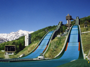 長野オリンピックの開催会場として記憶に残る白馬ジャンプ場です。柱脚で支えるヤグラ方式で建設されており、人口降雪システム、シュプールカッターにより世界最高レベルの整備状態を誇ります。HS-131 K-120、HS-98 K-90のジャンプ台を左右に併設した形で中央にそびえているスタートタワーは、観光客も登ることもできるため、選手が滑り出す地点の高さを実感できます。