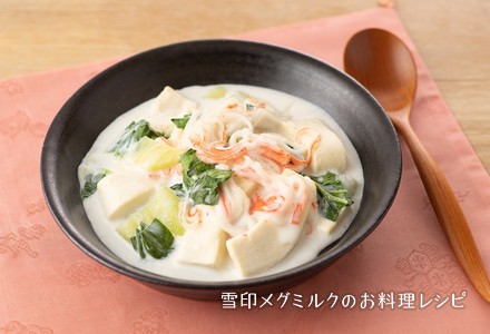 栄養豊富な高野豆腐、煮物以外の新たな使い方、味を追求しました。ポイントは高野豆腐を薄切りにし、そのままミルクベースの煮汁に入れることです。戻さなくても、水にくぐらせるだけで切りやすくなりますよ。すべての材料を一緒に煮始めても、野菜に火が通る頃には煮汁をたっぷり吸って味も馴染んでいます。短時間でできるのも嬉しいですね。高野豆腐とミルク?!と思われがちですが、乳脂肪がしっとりした口当たりに仕上げてくれます。