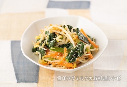 青菜には小松菜を、もやしは大豆イソフラボンが摂れる豆もやしを選び、粉チーズとごまでカルシウムUP!吸収の良い「すりごま」にするのもポイントです。