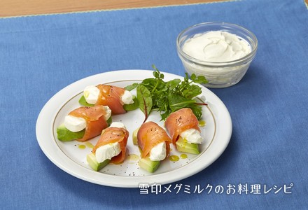 水切り塩ヨーグルトをサーモンで巻いたアレンジレシピ。