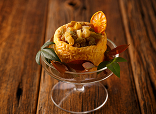 シャンパンの産地としても有名なフランス・シャンパーニュ地方ラングル高原が原産地のチーズ、ラングル。一番の特徴は、表面に泉(fonteine=フォンティーヌ)と呼ばれる噴火口のような窪みがあること。熟成期間中にチーズを一度も反転させないため、熟成に伴いだんだんと窪みが深くなり、ラングル独特の大きく窪んだ形状が生まれます。通はこの窪みに少量のマール・ド・シャンパンやマール・ド・ブルゴーニュを注いで楽しむとも言われます。フォンティーヌに、白ワインに漬けたドライレーズンとドライオレンジをのせて、器に見立てたアレンジも素敵です。