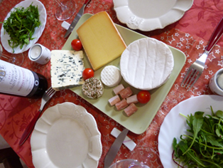 パリの一般的なホームパーティーのテーブル。チーズはアペリティフ(食前酒)のお供として出されることが多く、食事の前の軽いおつまみとして楽しみます。日本ではパーティを華やげる存在ですが、フランス人にとってのチーズとはあくまでも「日常の食事」として食べるものです。