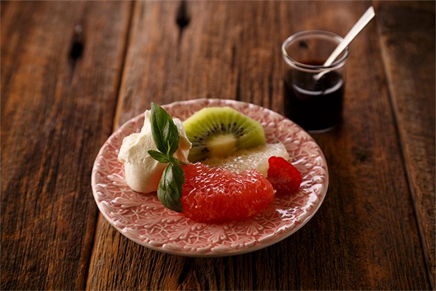 グレープフルーツ等、酸味のあるフルーツに「雪印北海道100 クリームチーズ」を添えて。さらに、バルサミコ酢の酸味を重ねれば、暑い季節にも喜ばれるさわやかなオードブルの一皿に。