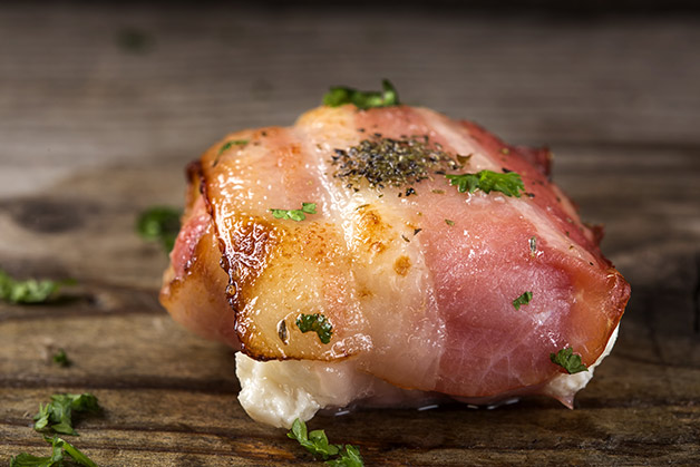 次は、チーズとベーコンの相性バッチリなおつまみ。「カマンベールチーズ」丸ごと一個に、大胆にベーコンを巻き付けていきます。幅が細いベーコンの場合は、タテヨコ斜めと少しずつずらしながら放射状に巻き、隙間なくチーズを包むようにしましょう。巻き終わったら、フライパンで両面をソテー。少しチーズがとろけてきたら食べ頃です!ガーリックパウダーをふりかけると、風味が増しますよ。