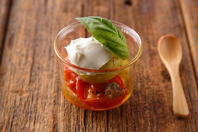 夏・・・「マスカルポーネ」や「カッテージチーズ」に代表されるフレッシュタイプのチーズなら、真夏でもさっぱりといただけます。冷やしたデザートグラスに盛り付けてお皿の中央に置き、視覚的にも涼を感じて。