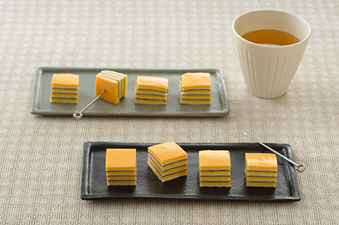 - 温かいほうじ茶と合わせると、チーズとのりの香りがふわっと広がります。スライスチーズとのりが織りなすストライプが、ちょっとモダンなお茶うけ。