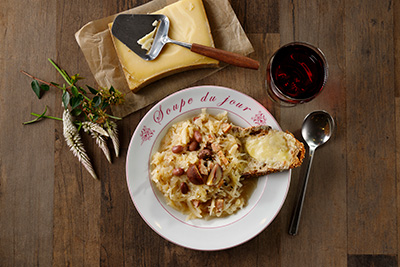 フランスの山のチーズ「ボーフォール」をのせてトーストし、キャベツたっぷりのスープと合わせて。