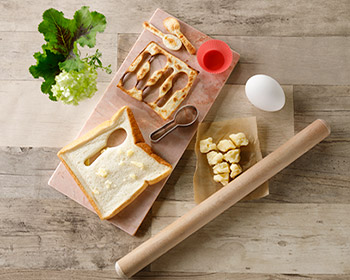 - ①食パンの耳をカットし、「雪印北海道100 芳醇ゴーダ クラッシュ」をのせ、めん棒で薄くのばし、型で抜いてこんがりトーストする。