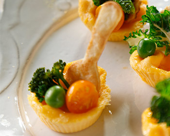 器にみたてたアレンジがポイント、華やかで立体的な盛り付けに。
