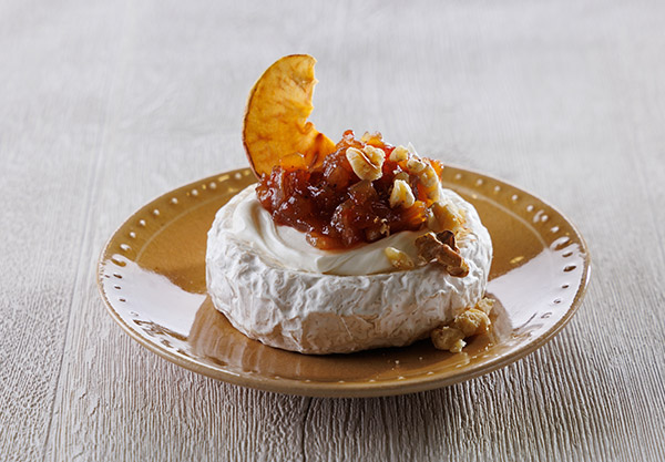 「雪印北海道100 カマンベールチーズ」に「雪印北海道100 マスカルポーネ」を適量のせて、チャツネをトッピング。くるみ・りんごチップスをのせて。