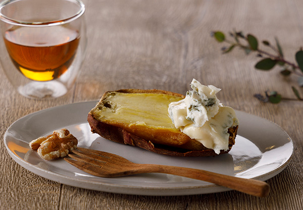 とろーりクリーミー、程よい塩味と青かびの個性が穏やかなゴルゴンゾーラ ドルチェに、ねっとり甘い焼き芋を合わせて。くるみを添えて。香ばしいほうじ茶と一緒に。デザートとしても。