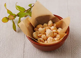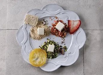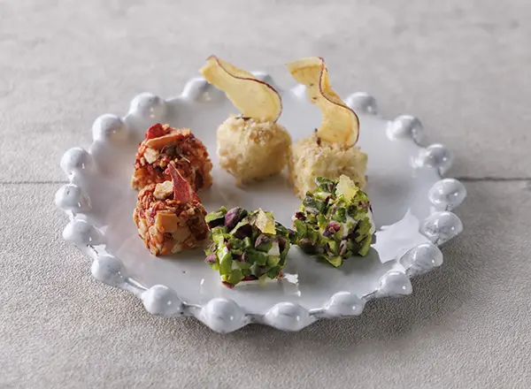 - ①「チーズのための玄米クラッカー」をパウダー状にすりつぶし、まとわせる。さつまいもチップスとキャラウェイを添える。