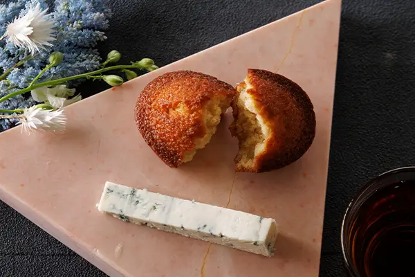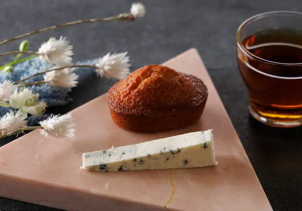 「ブルー」の旨味と塩味に、フィナンシェの香ばしいバターの香りと甘さが相性よく重なります。