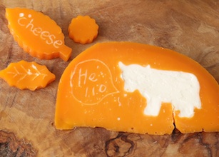 ちょっとしたお呼ばれの時、チーズはおしゃれで美味しいギフトにピッタリです。もっとおしゃれにしたい時は、チーズカービングをお薦めです。カービング(彫刻)は、ゼムクリップでチーズの表面にメッセージを書くのです。クリップで掘れた溝に、クリームチーズを塗り込み、溝の外に出たクリームチーズを拭き取れば出来上がり。オレンジ色のミモレットが特にお薦めです。クリームチーズの白い文字がくっきり浮き出ます。クリスマスパーティーやお誕生日の心のこもったギフトになること請け合いです。